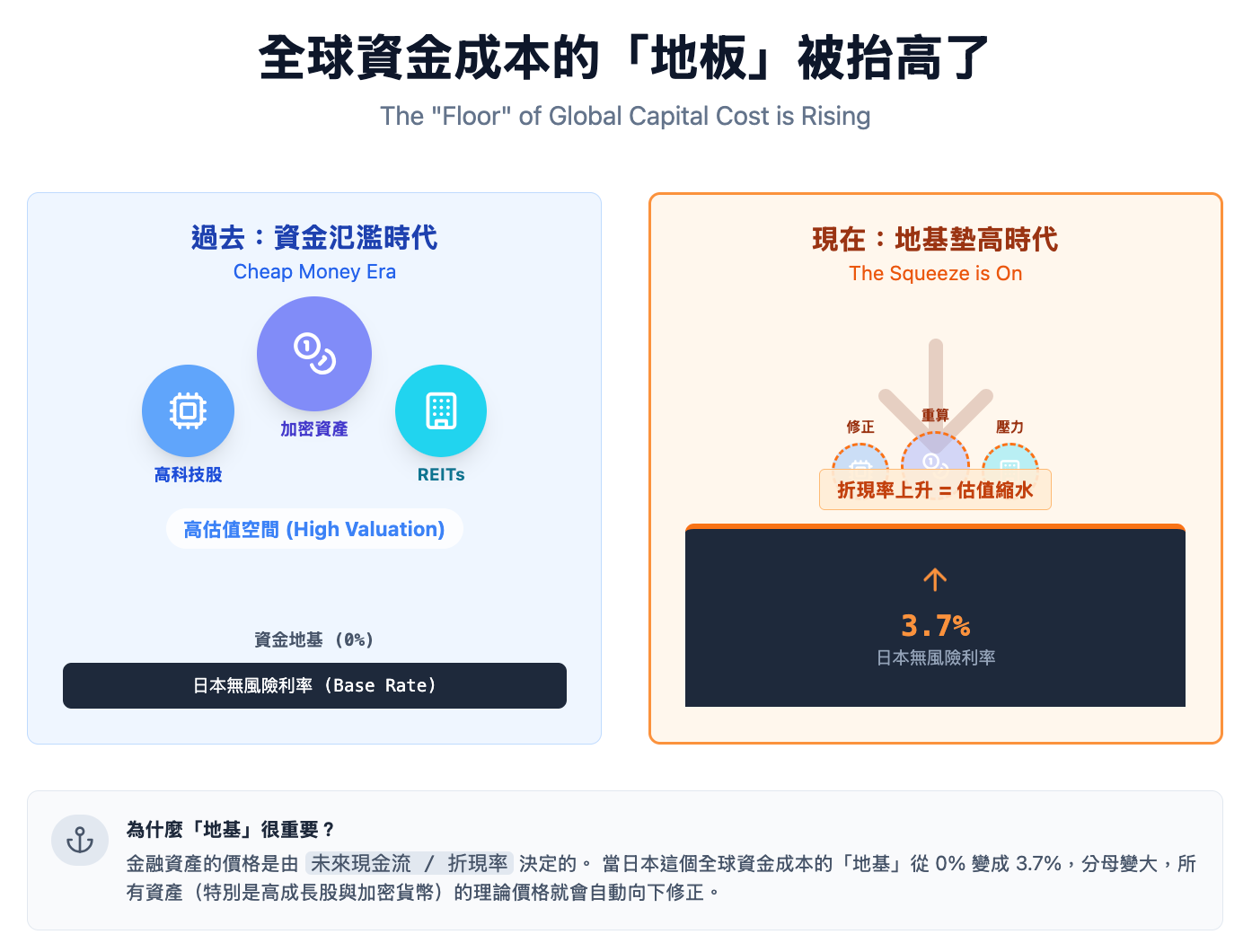 更進一步說,我們必須理解一個關鍵概念:日本利率不只是一個數字,它是全球資金成本的「地基」。