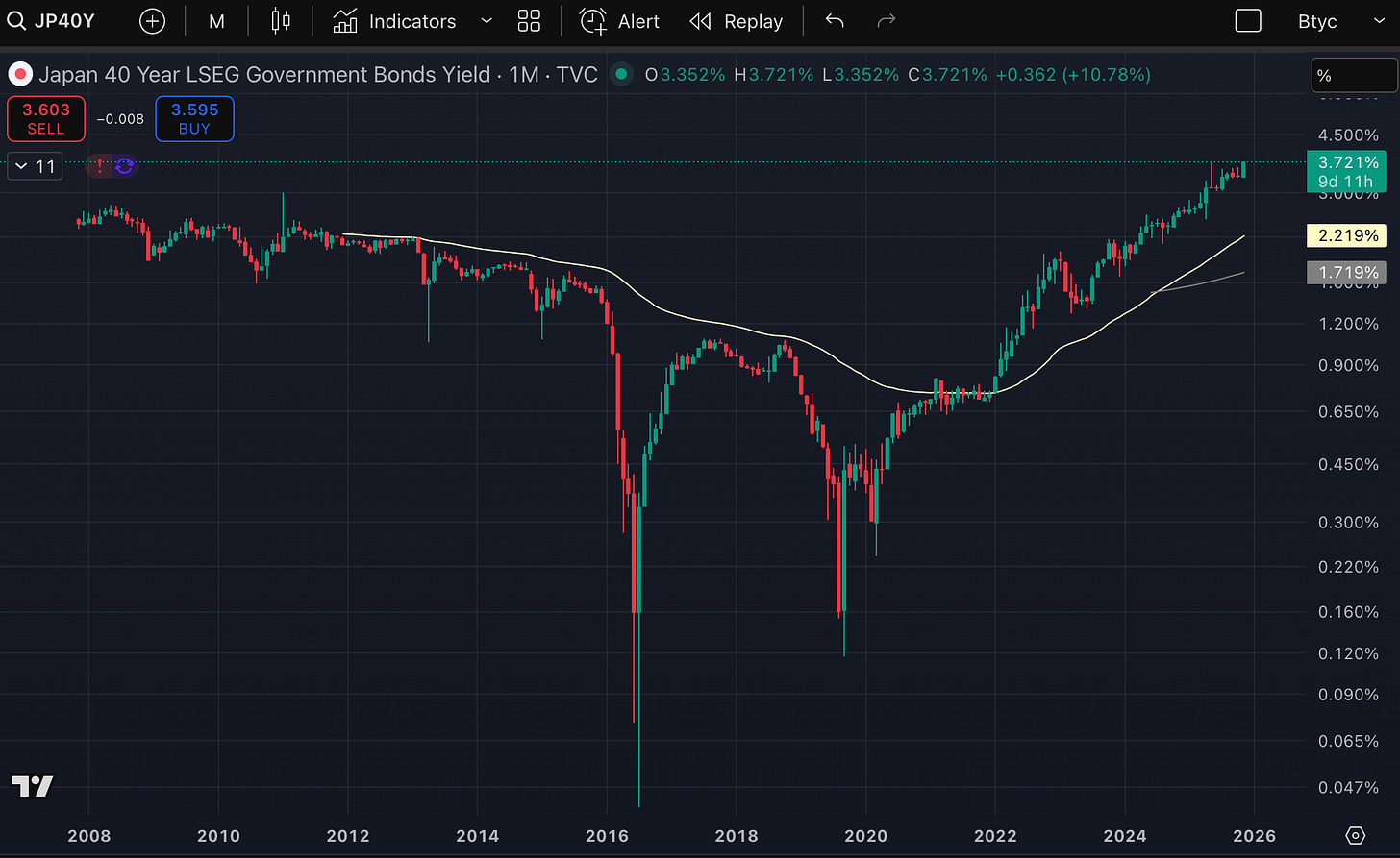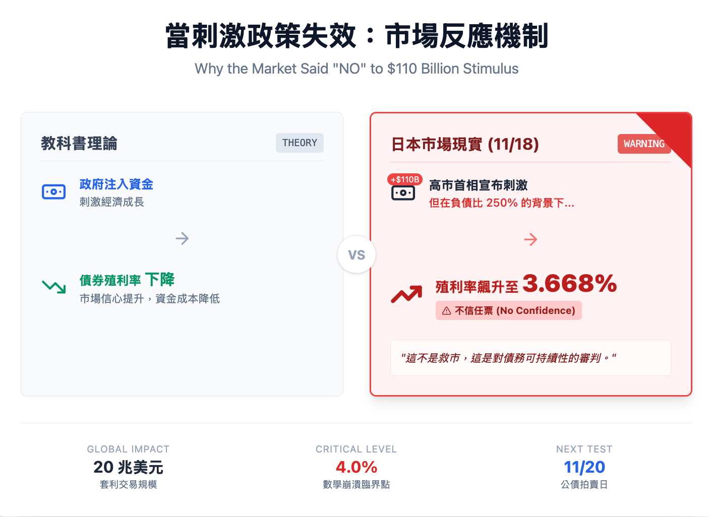 日本 40 年期公債殖利率觸及 3.721%,創下 2007 年以來新高。最弔詭的是,這發生在高市首相宣布投入 1,100 億美元 的刺激計畫之後。照理說,政府承諾撒錢救市應該會讓市場安心,但這次,市場卻反手拋售債券。