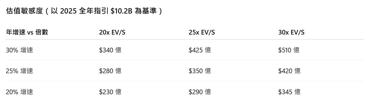 這張表顯示了在不同成長與倍數假設下,Figma 的市值落點。可見增速下滑或市場給予的倍數收縮,都可能對估值帶來顯著影響,