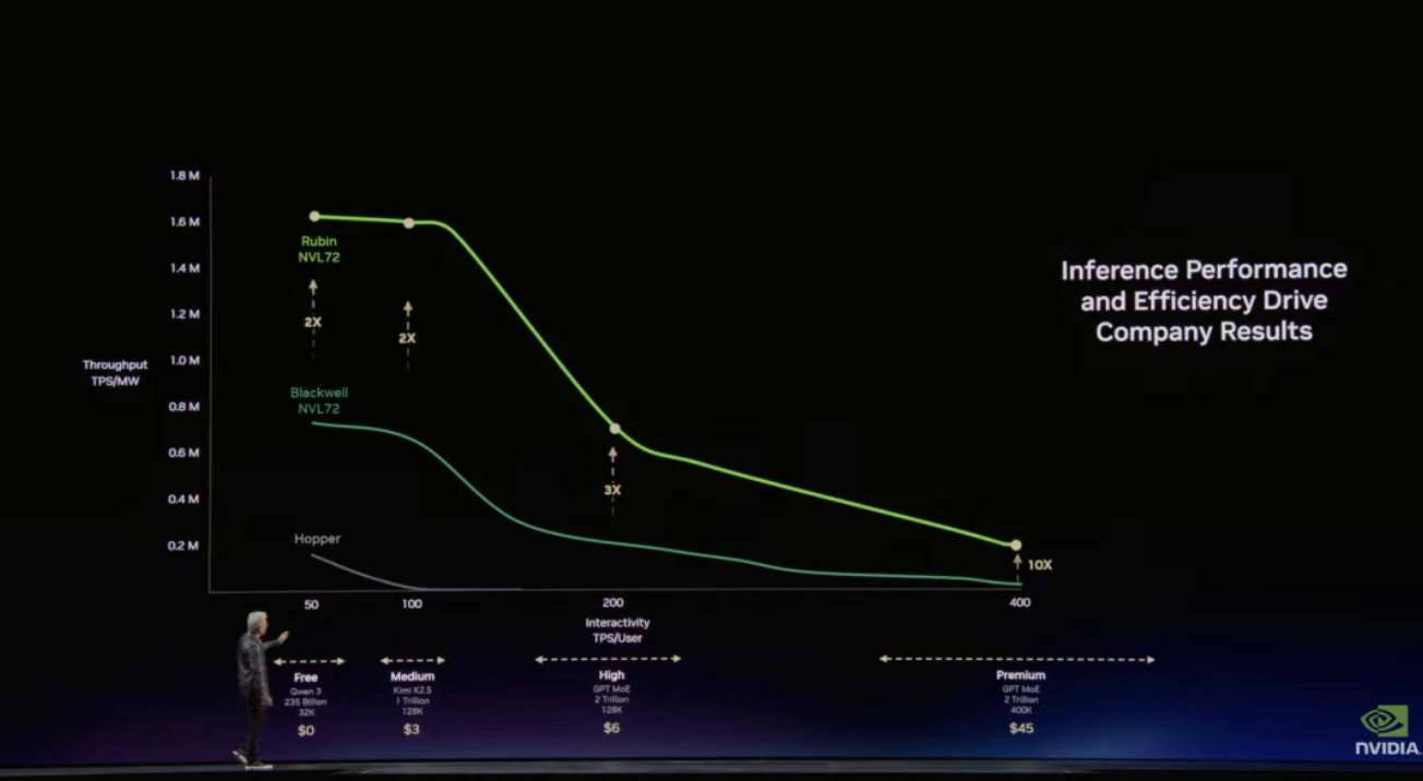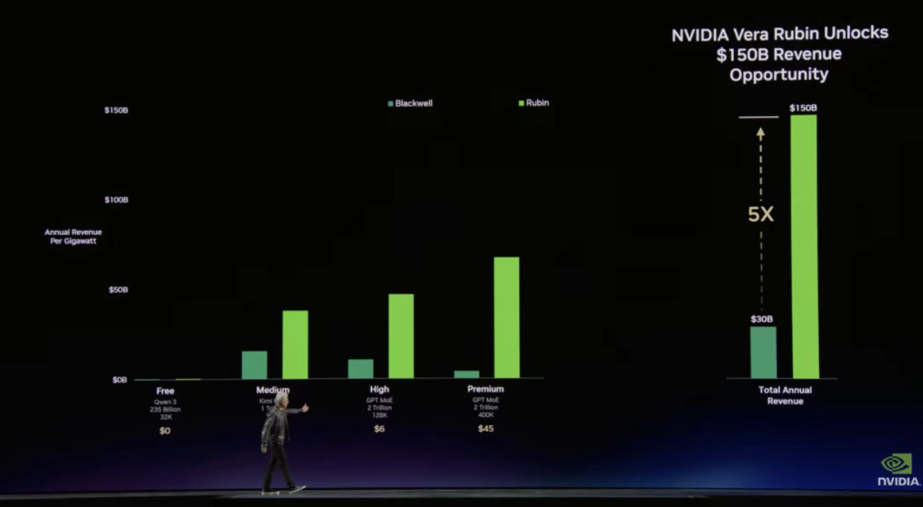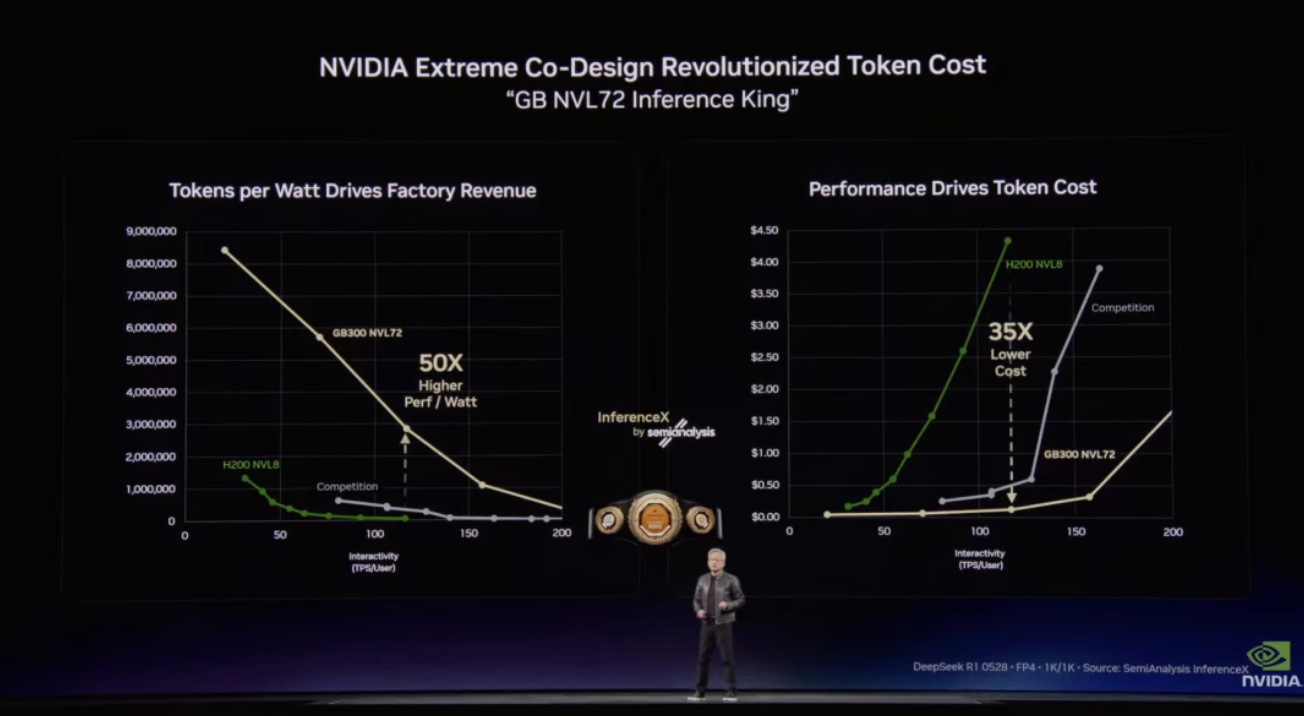 黃仁勳強調,很多人曾經認為推理是 AI 系統中最簡單的部分,但實際上推理既是最困難的環節,也是最重要的商業環節,因為它直接決定 AI 服務的收入來源。根據研究機構 SemiAnalysis 的評測,在資料中心層面,衡量 AI 系統效率的指標是每瓦特能夠生成多少 token(tokens per watt)。