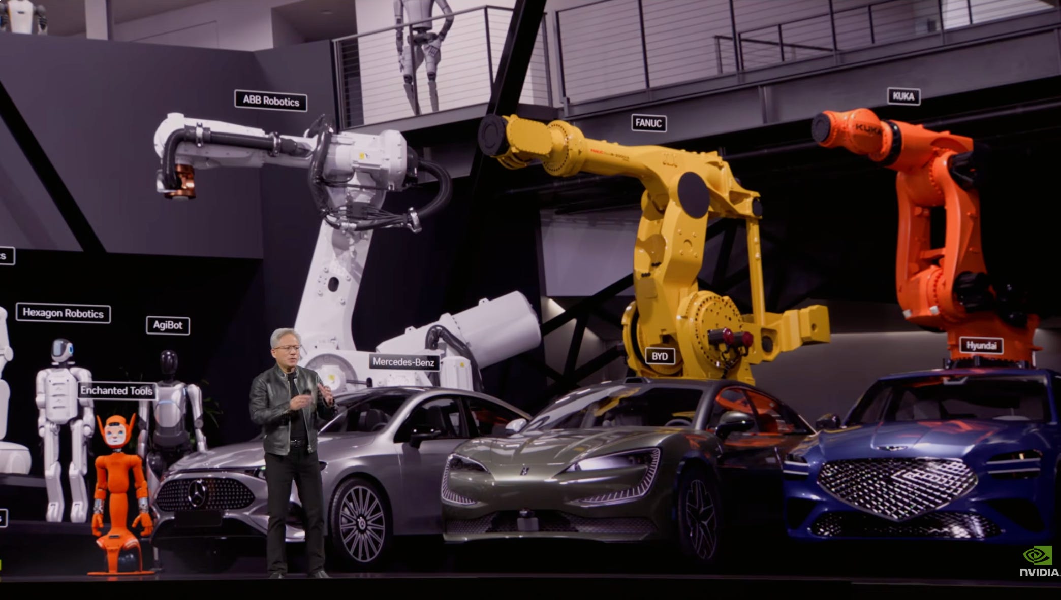 在自動駕駛領域,黃仁勳認為「自動駕駛的 ChatGPT 時刻已經到來」。基於 NVIDIA Drive AV 和相關模型,車輛現在已經具備推理能力,可以解釋自己的駕駛決策並執行語音指令。NVIDIA 還宣布新的 Robotaxi 合作夥伴,包括 BYD、Hyundai Motor Company、Nissan 和 Geely,這些公司每年合計生產約 1800 萬輛汽車。同時,NVIDIA 還將與 Uber 合作,在多個城市部署自動駕駛計程車網路。