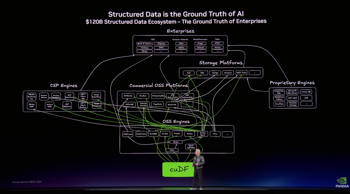 黃仁勳指出,長期以來企業運算的基礎建立在結構化資料之上。無論是 SQL、Spark、Pandas 等技術體系,還是諸如 Snowflake、Databricks、Amazon 的 EMR、Microsoft 的 Azure Fabric,以及 Google 的 BigQuery 等大型資料平台,本質上都在處理一種核心資料結構「資料框」(DataFrame)。這些資料框可以被理解為巨型電子表格,承載著企業營運和業務決策所依賴的關鍵資訊,是企業運算體系中的「事實來源」。 過去,對結構化資料的加速主要是為了提升企業級的資料分析效率,讓運算任務完成得更多、成本更低,並且能夠在一天內更頻繁運行資料處理流程,從而讓企業營運更加高效、更加同步。但在 AI 時代,過去的邏輯正在發生變化,未來不僅人類會使用這些資料,AI 系統和 Agent 也會直接訪問和使用結構化資料庫,而 AI 的處理速度遠遠快於人類,這意味著資料處理基礎設施必須獲得數量級的效能提升。