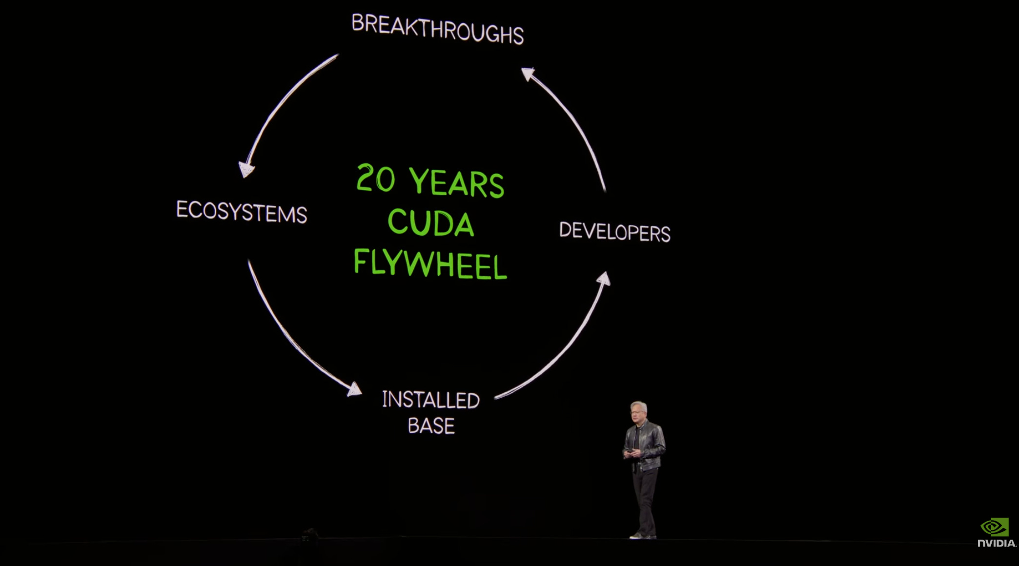「CUDA 的安裝基數,是飛輪加速的原因。安裝基數吸引開發者,開發者創造新演算法,帶來技術突破。這些突破催生全新市場,圍繞它們形成新的生態,更多公司加入,進而擴大安裝基數。」