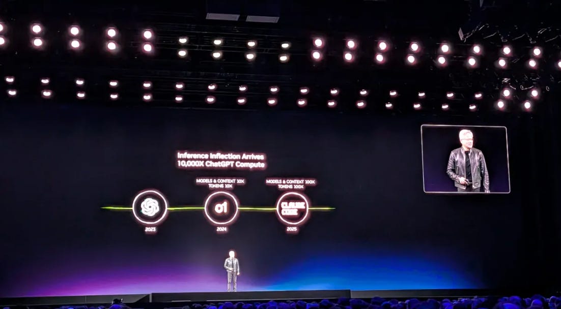 黃仁勳表示,「AI 已經從“感知”進化到“生成”,再到“推理”,現在已經可以執行極其高效的工作。 “推理拐點”已經到來。 AI 要思考、要行動、要閱讀、要推理,每一環都在進行推理。現在已經遠超訓練階段,進入了推理的疆場。過去兩年,計算需求增長了約 10,000 倍,而使用量增長了約 100 倍。我深感這兩年的計算需求實際增長了 100 萬倍。」