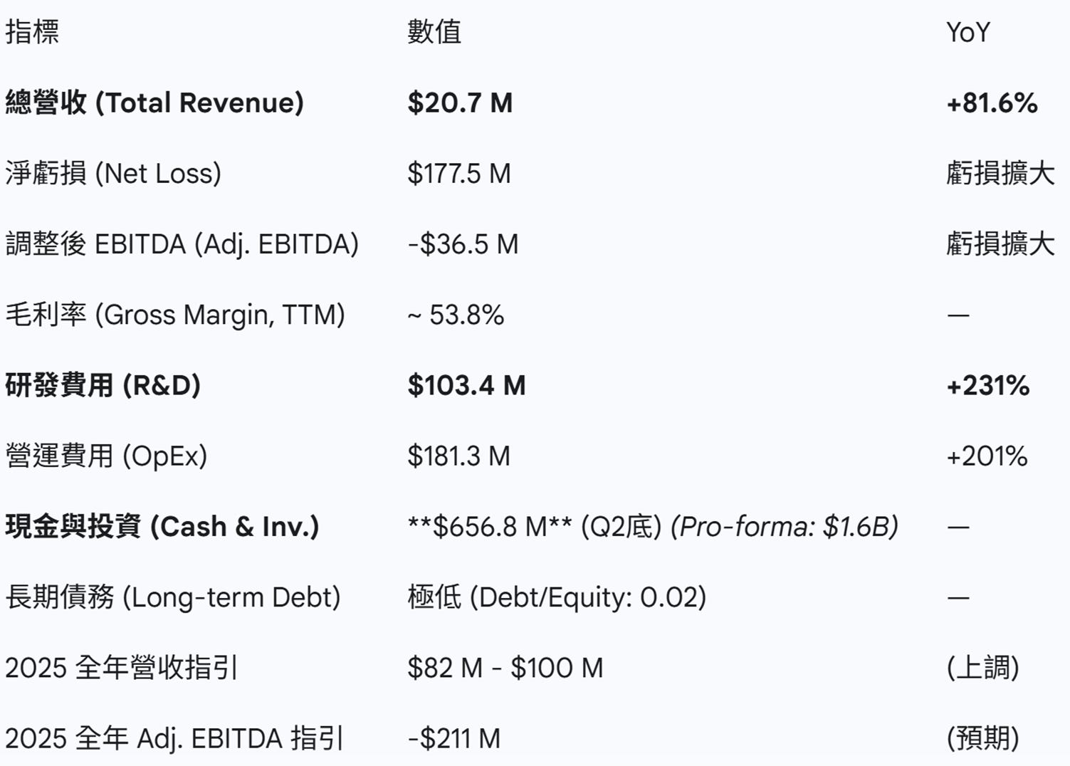 營運虧損:2025 Q2 淨虧損 1.775 億美元,調整後 EBITDA 虧損 3,650 萬美元。公司預計 2025 全年調整後 EBITDA 虧損將擴大至 2.11 億美元。