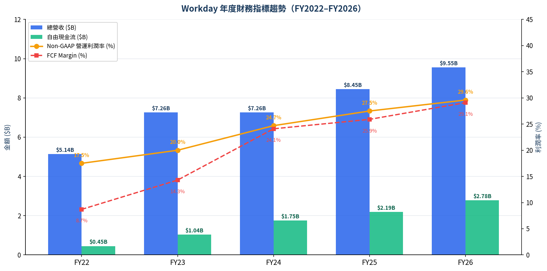 以下是 Workday 近五年的核心財務指標趨勢,可以清楚看到營收穩健成長、自由現金流大幅提升、利潤率持續增長的良性循環。